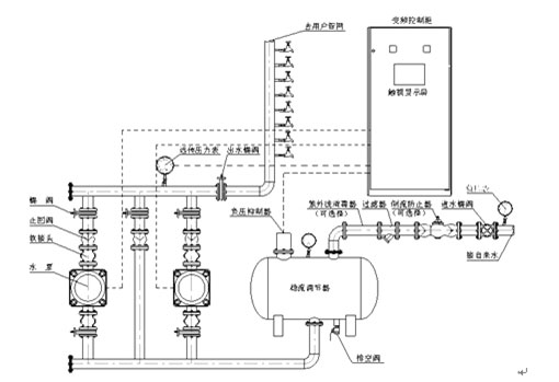 RWG系統(tǒng)智能型無(wú)負(fù)壓變頻供水設(shè)備是由穩(wěn)流調(diào)節(jié)器、負(fù)壓抑制器、水泵機(jī)組、智能變頻控制柜、遠(yuǎn)傳壓力表、各種閥門管件等組成。其原理圖如下所示。